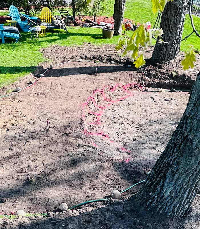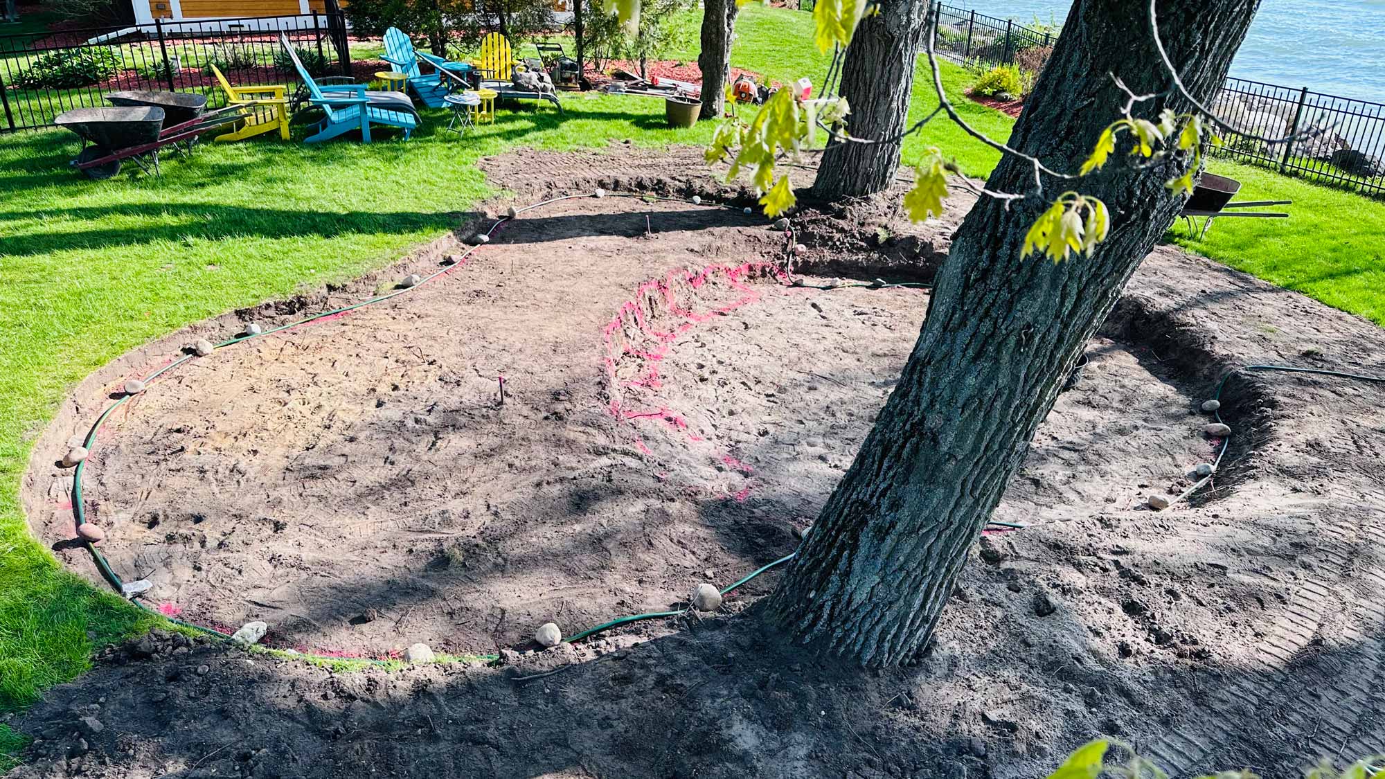 The initial form of the patio is dig into the landscape. This included careful planning to best use the exsisting trees and orientation of the property to the lake.
