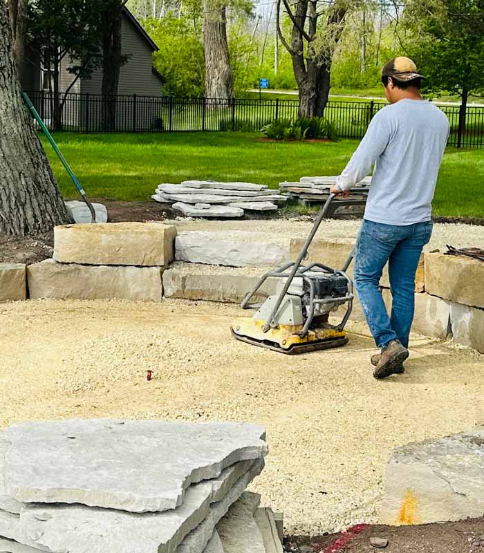 As the team build each layer, gravel is compacted to create a solid foundation for the larger blocks to build the wall, or larger flat pavers to create the natural stone patio.